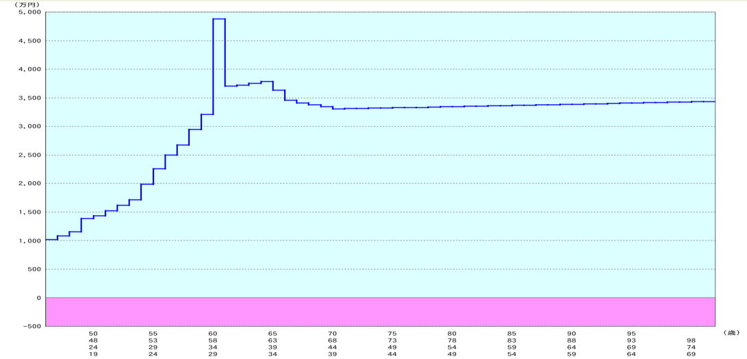 ご主人が65歳まで、奥様が60歳まで働く想定です。ご主人は多少の収入上昇を見込み、また退職金として60歳の時に1,500万円を受け取り、その後は再雇用で65歳までは年収400万円の想定です。奥様は将来の収入上昇を見込まず60歳まで働くこととし、退職金もなしでシミュレーションします。