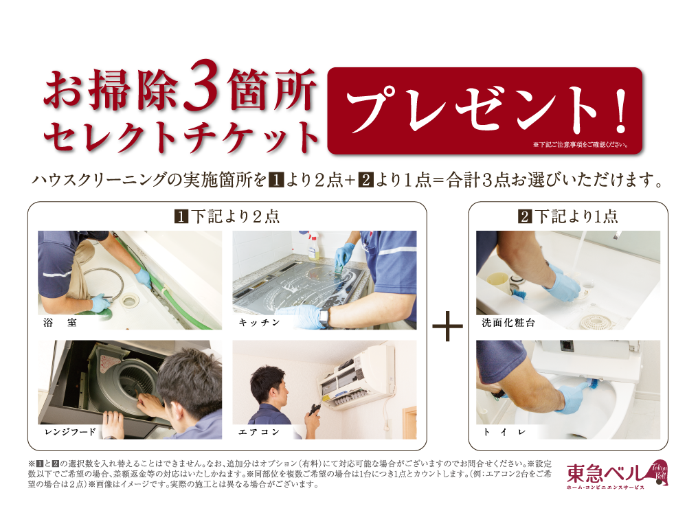 キッチンや浴室等からお好きな3箇所をセレクトできる「ハウスクリーニングチケット」をプレゼントいたします。