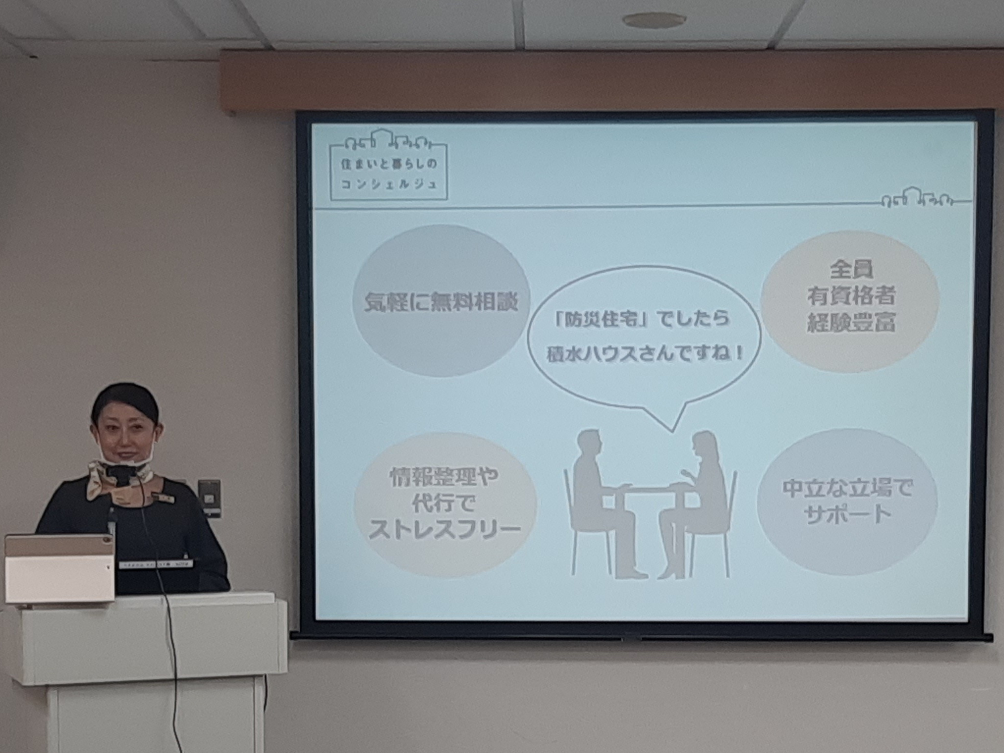 続いて、積水ハウス東京南支店の篠営業次長のごあいさつ、そして、本題である、「防災住宅」について、積水ハウス環境推進部の福田部長よりお話いただきました。