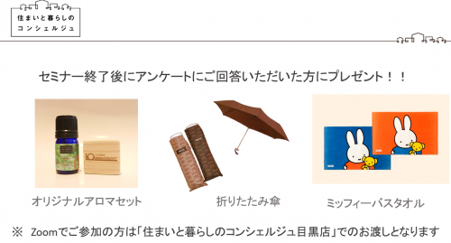 当日ご参加いただき、アンケートにご回答いただいたみなさまには目黒店にてプレゼントをご用意してお待ちしております。