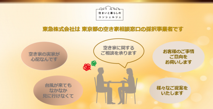 東急株式会社は東京都の空き家相談窓口の採択事業者として、空き家に関するご相談を承っております。お客様のご事情、ご意向をお伺いし、様々な解決策や活用方法をご提案しております。