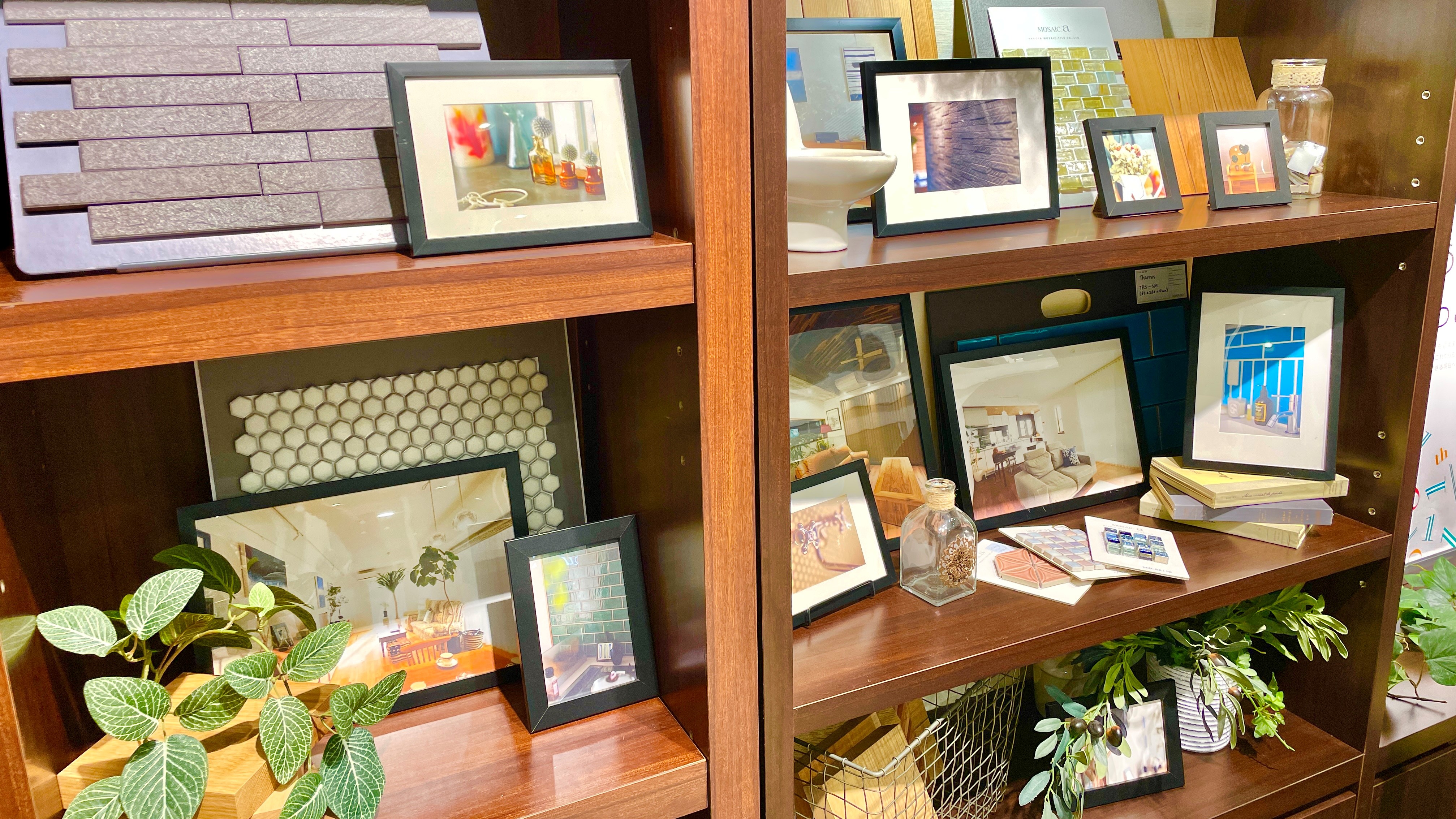 コンシェルジュの提携リフォーム会社である「髙松テクノサービス株式会社」にご協力いただき、実際の事例のパネルや内装タイルの実物サンプルなどを店頭に展示をしております。