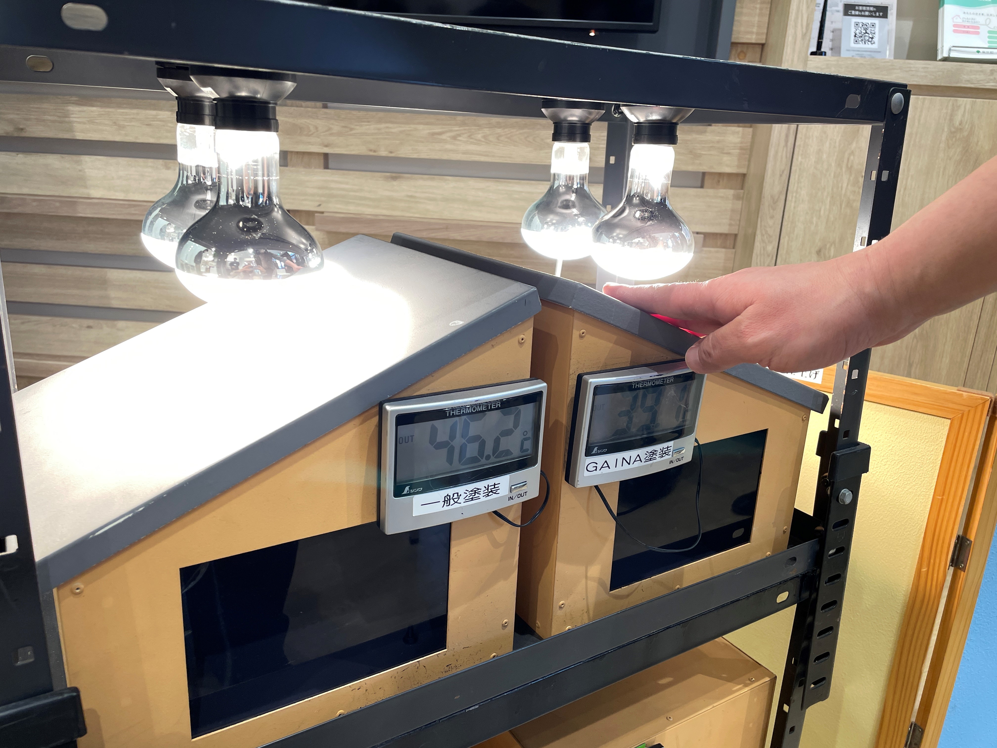 一方、右のガイナを塗った屋根は、手で触れられるぐらいの熱さにおさえることができています。
