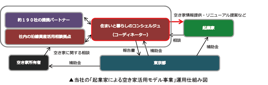 「起業家による空き家活用モデル事業」は、都内に約81万戸あり※、今後も高齢化などによる増加が見込まれる空き家問題を受け、空き家の新たな利活用を試みる起業家を支援し、問題解決に繋げる目的で東京都が開始するものです。当社が選定された「コーディネーター事業」は、起業家からの相談に対応するなどし、都内の空き家所有者と結びつけ、事業実現をサポートする役割を担います。(※「平成30年住宅・土地統計調査」より)