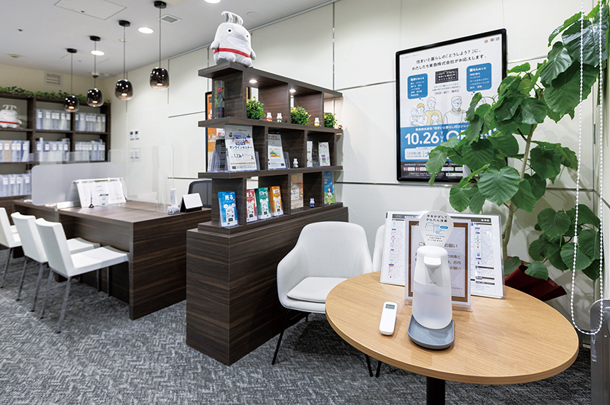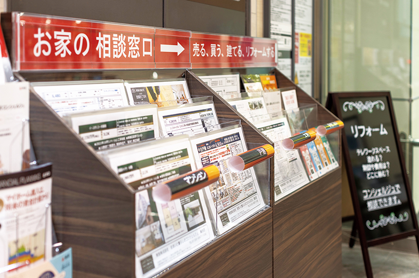 当店は東急多摩川・池上線蒲田駅改札出口からすぐの場所にあります。店内はお住まいに関する展示や、大田区エリアを中心とした不動産情報も数多く取り揃えています。